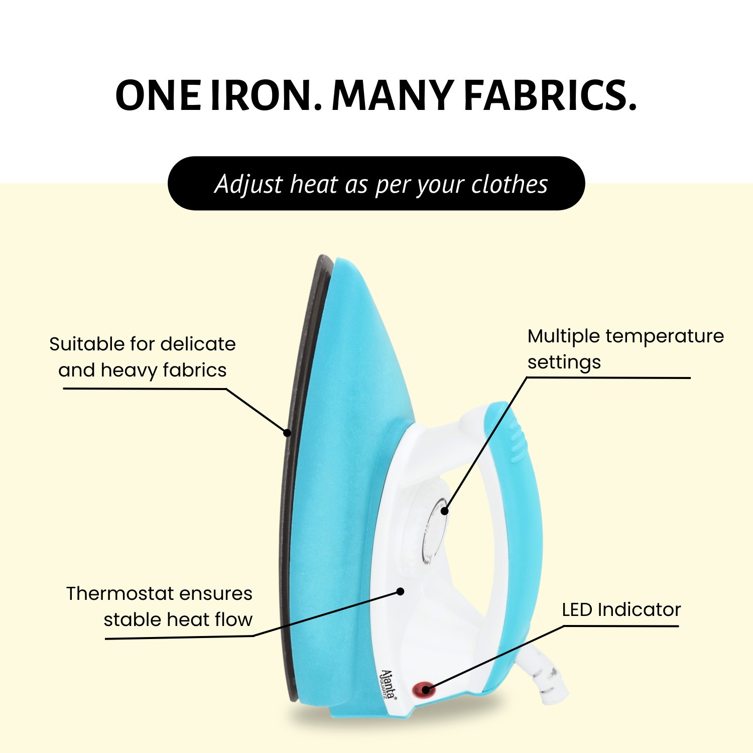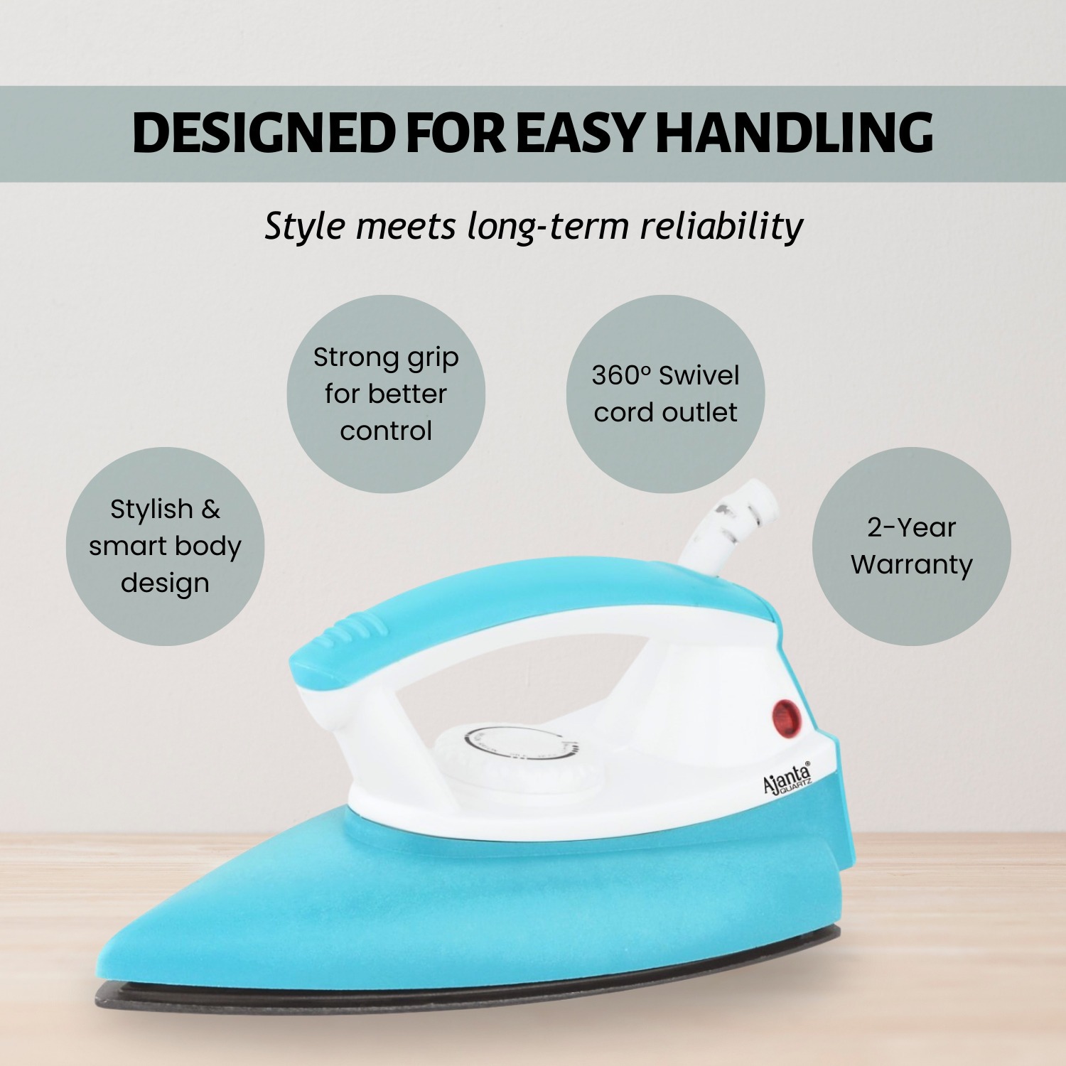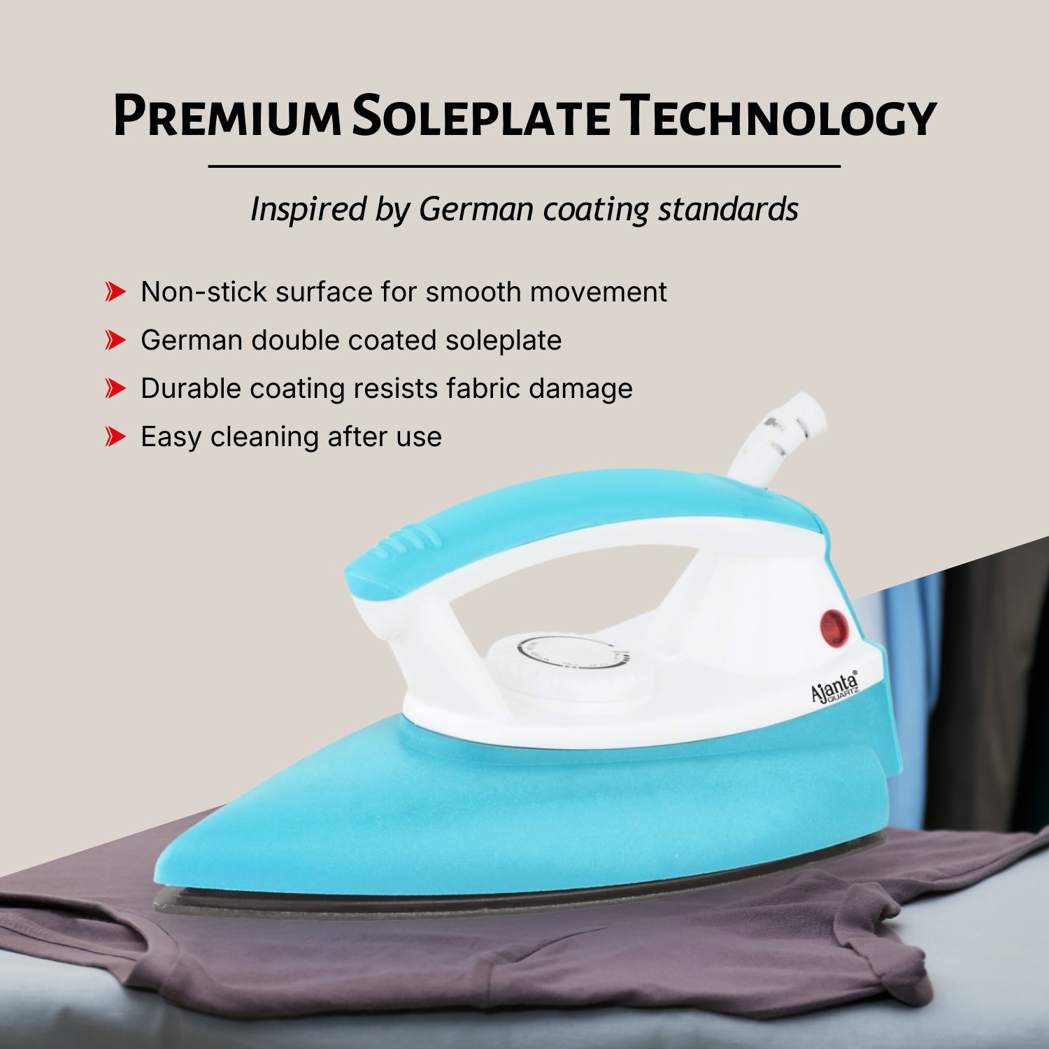 Ajanta Aeroslide Dry Iron offers 1000W power with thermal fuse protection and multi-temperature levels for precise fabric care. Its German double-coated soleplate ensures smooth gliding, while the smart design enhances grip and control.