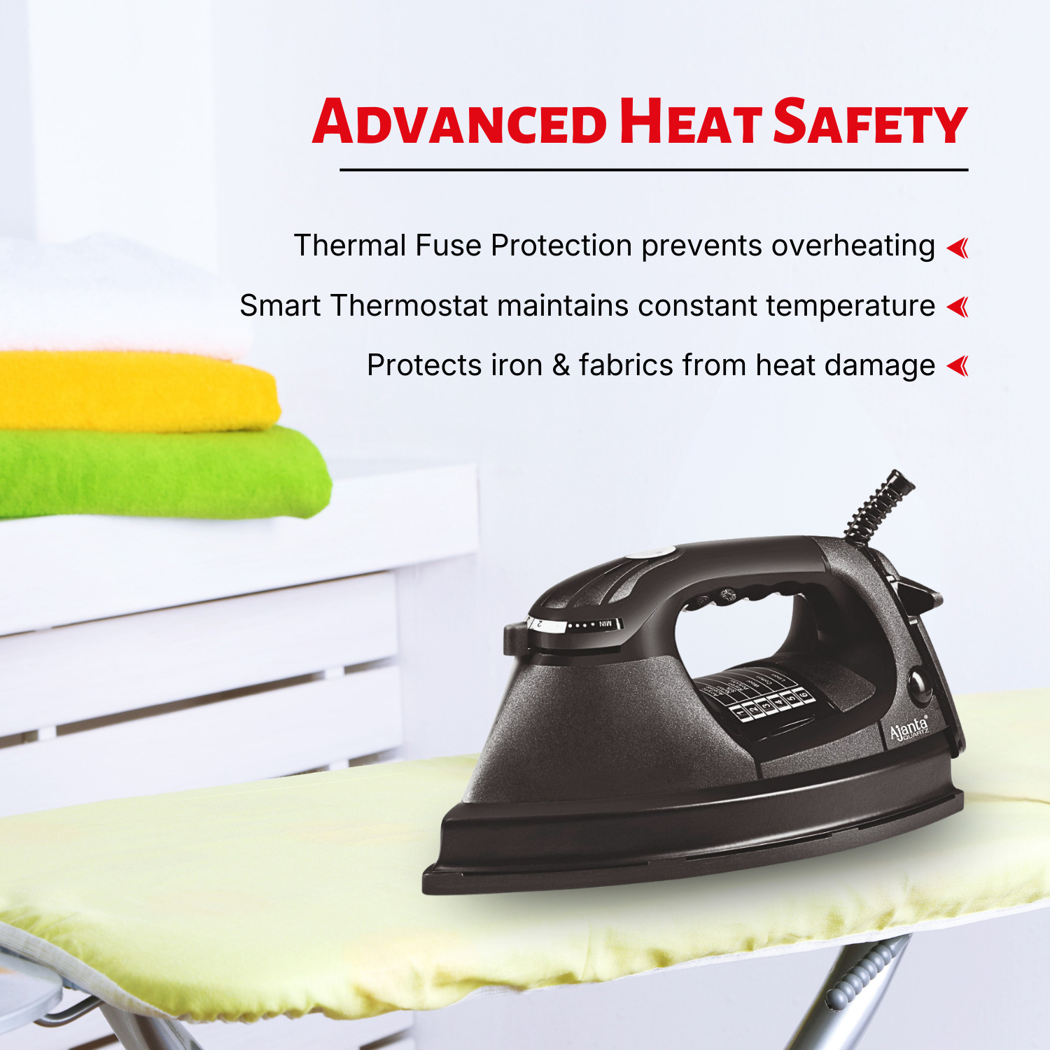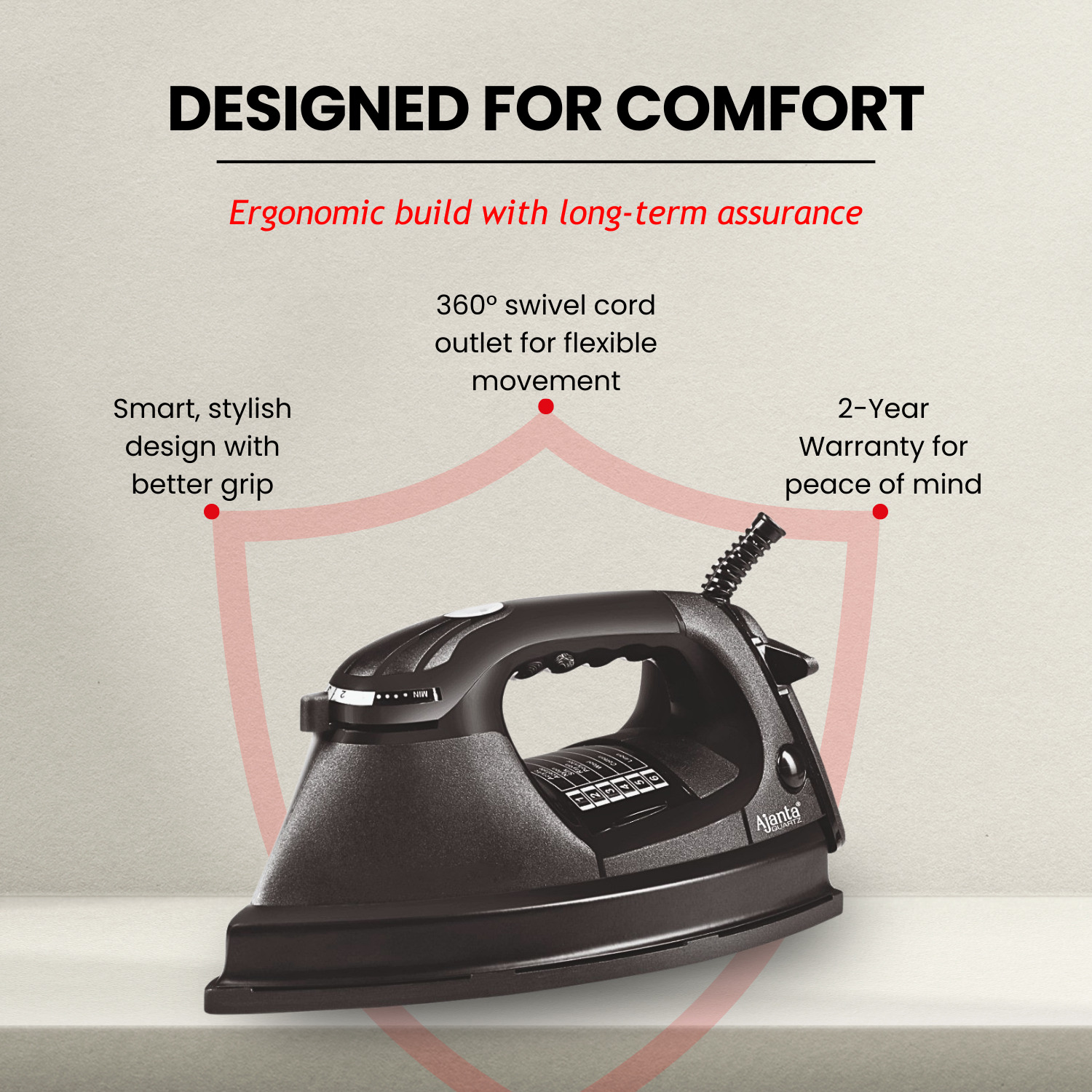 Ajanta Aeroslide Dry Iron offers 1000W power with thermal fuse protection and multi-temperature levels for precise fabric care. Its German double-coated soleplate ensures smooth gliding, while the smart design enhances grip and control.