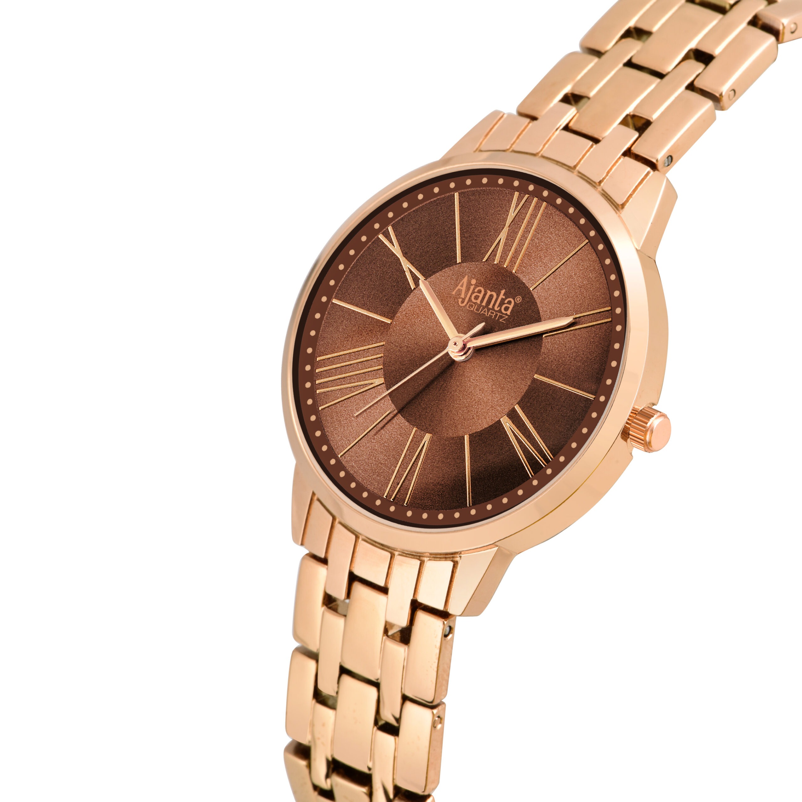 This round stainless steel watch features a rich brown dial paired with a smooth rosegold strap. The 10mm case profile delivers a balanced look that complements both formal and casual wardrobes.