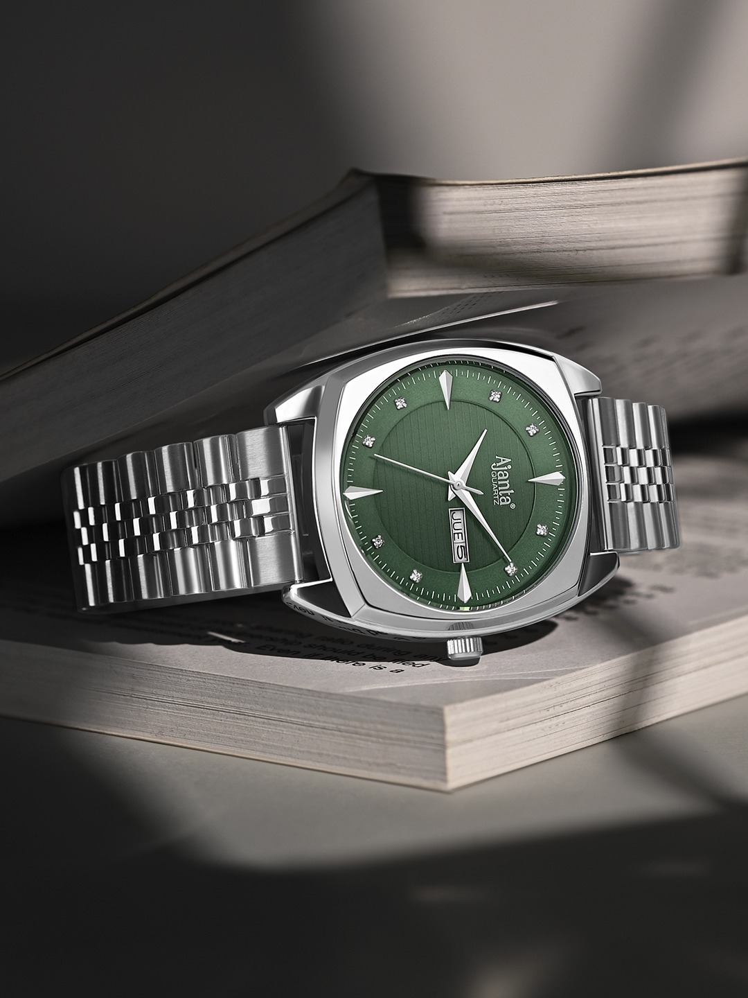 The watch features a rich green dial with a subtle textured finish that adds depth and sophistication to its overall look. The dial is complemented by crystal-style hour markers and sharp silver hands, creating a premium and eye-catching appearance. The silver-tone stainless steel case and bracelet enhance durability while giving the watch a timeless and polished finish.