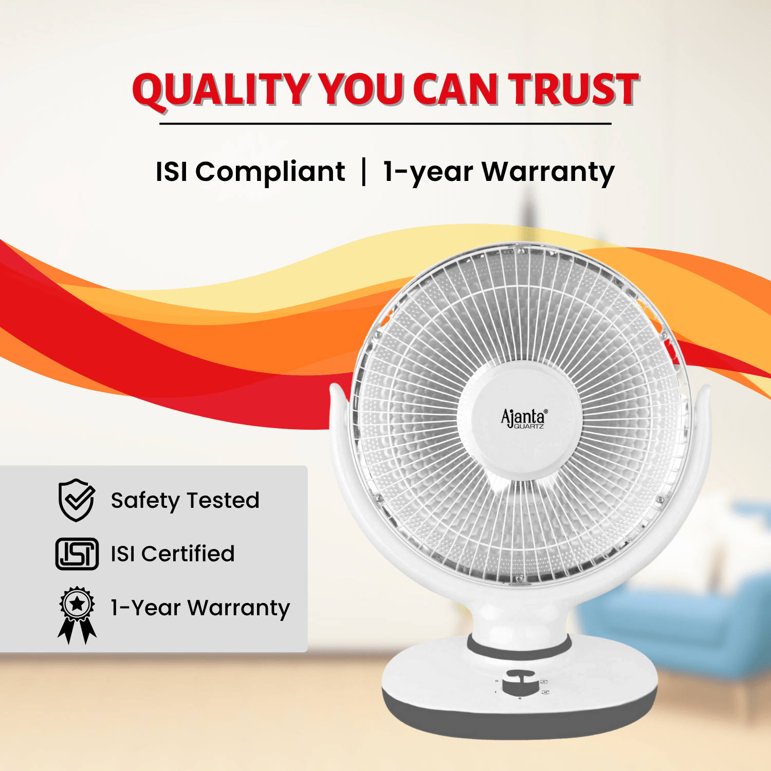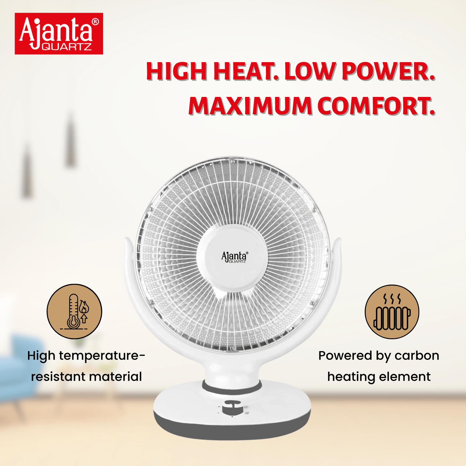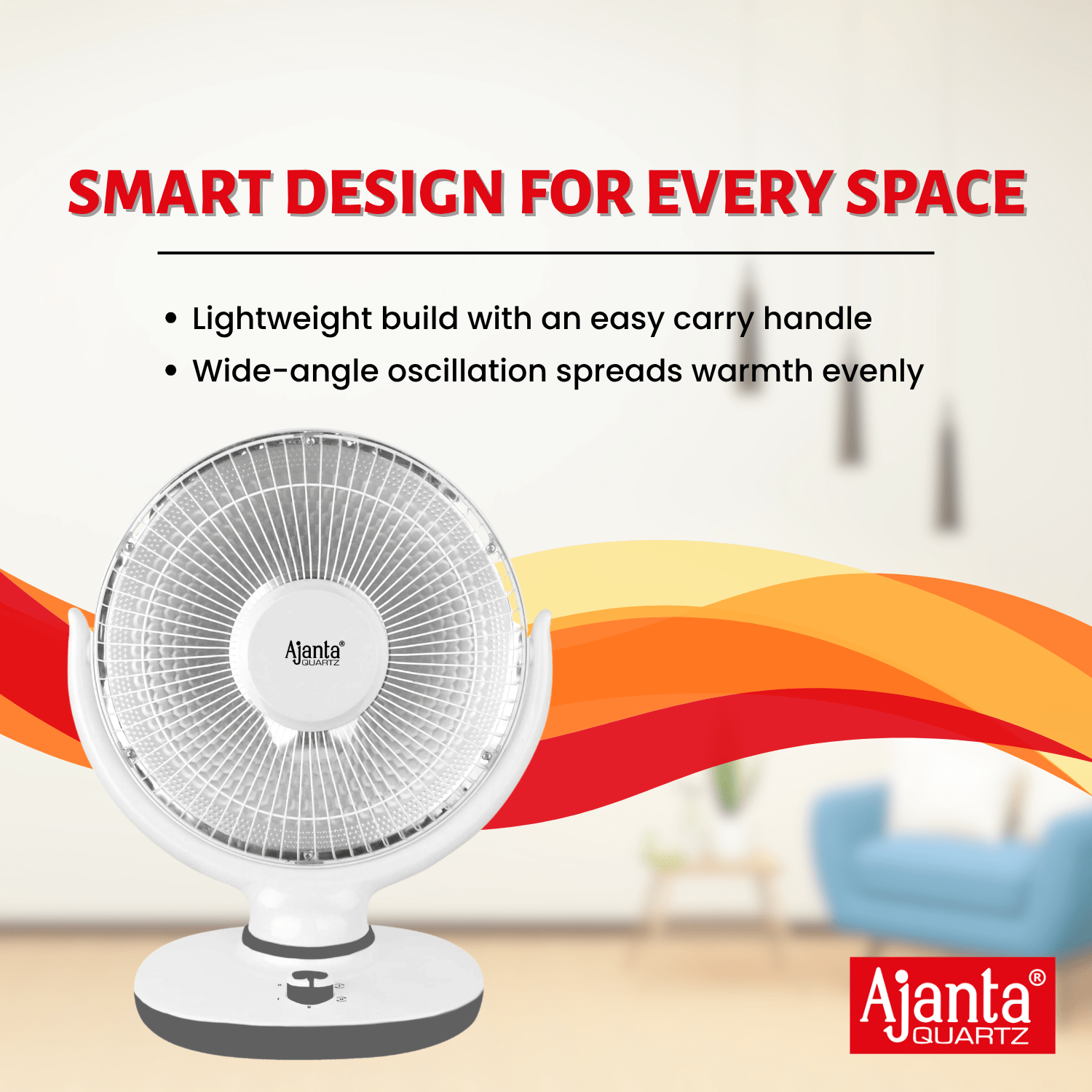 Ajanta Quartz Heater offers 800W of instant heating with two adjustable heat settings—400W and 800W—for flexible warmth. Designed with high-quality quartz tubes for efficient, low power consumption, it features a built-in safety tip-over switch for added protection. Its compact body, elegant design, and easy-to-carry handle make it ideal for cozy comfort anywhere.