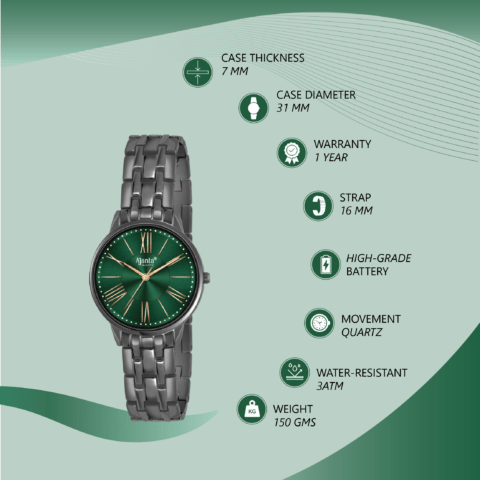 A simple watch with decent dial design. Chain strap is also good. Does not corrode. Best product from Ajanta at reasonable price.