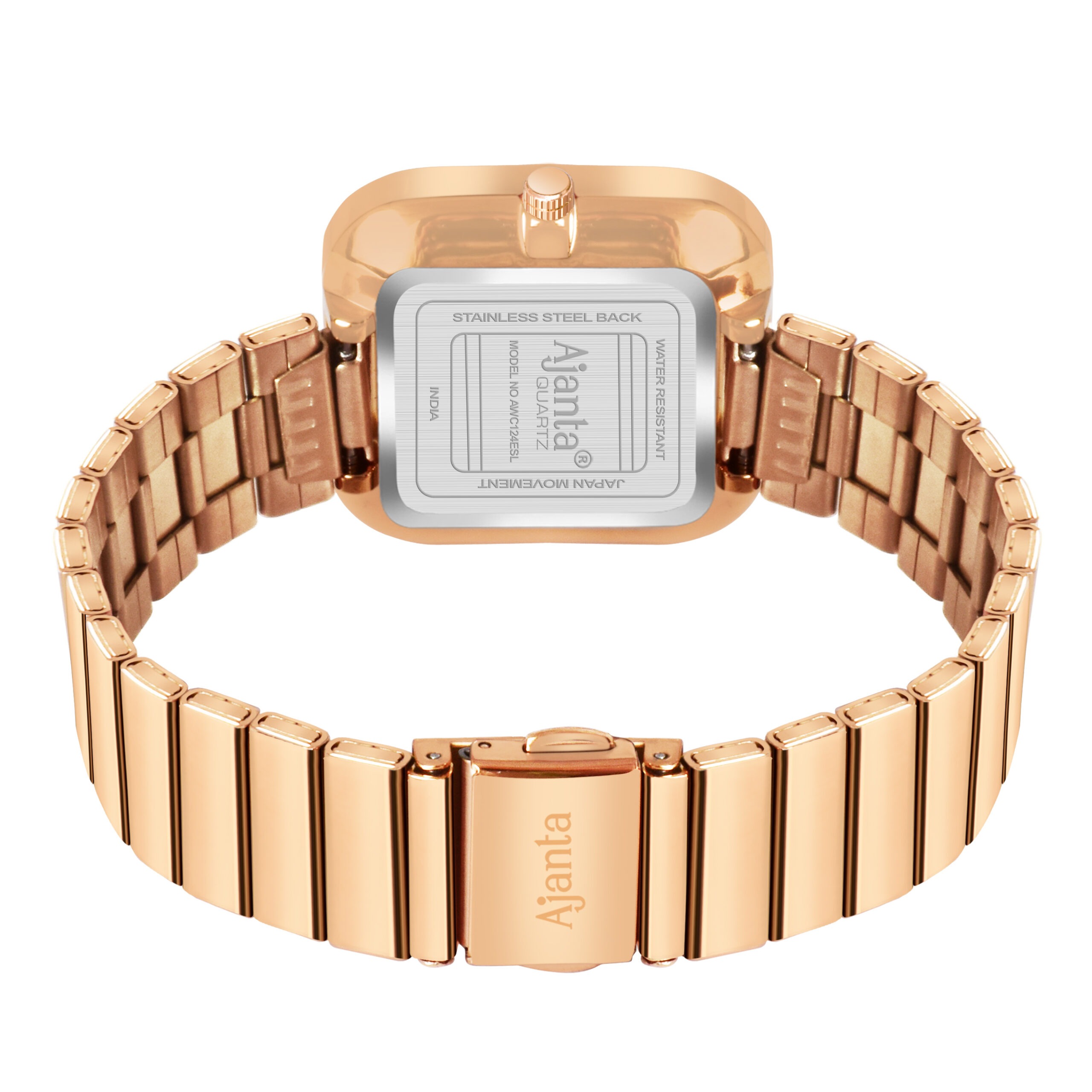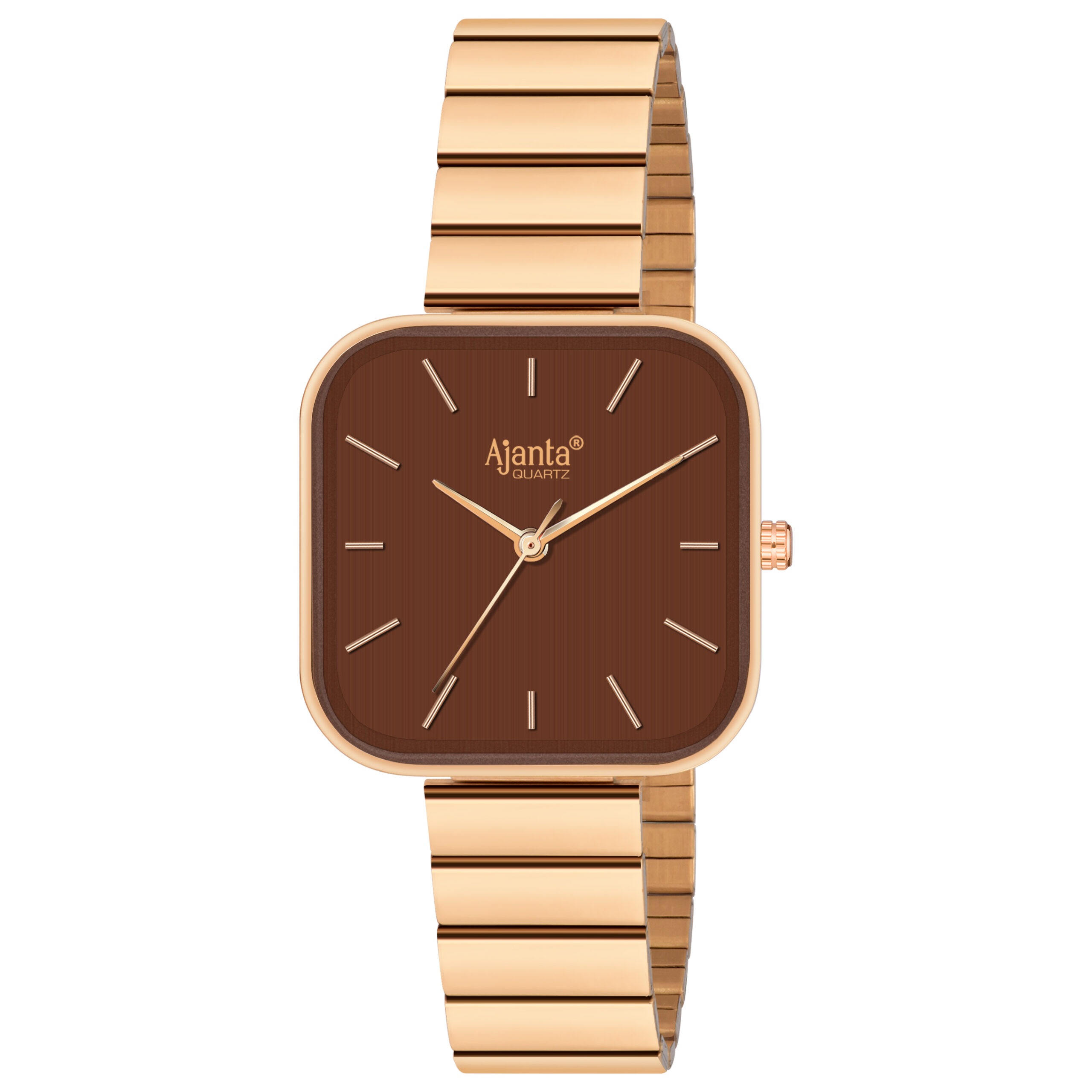 The Ajanta AWC124-4 from the La Luna Collection features a 34mm square case with a minimalist brown dial. Its sculptural metal strap offers a modern touch, making it a practical and stylish option for daily wear.