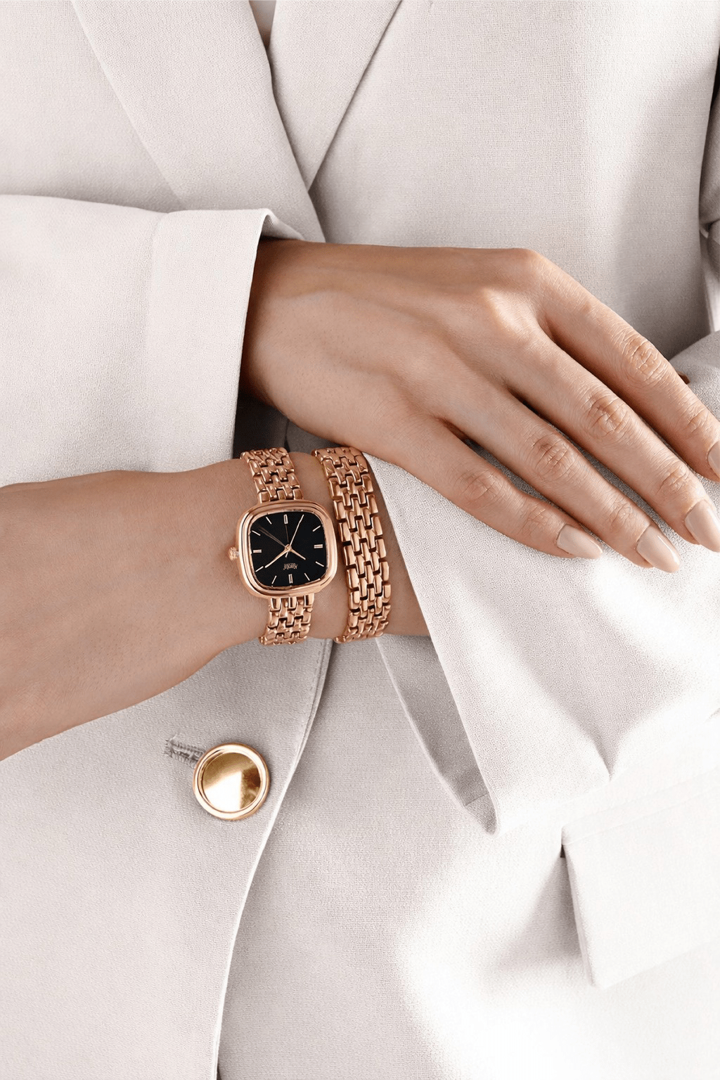AWC127-2 from the La Luna Collection features a 30mm rounded square case with a minimalist black dial. The interlinked textured strap comes with an additional strap for added style and versatility.