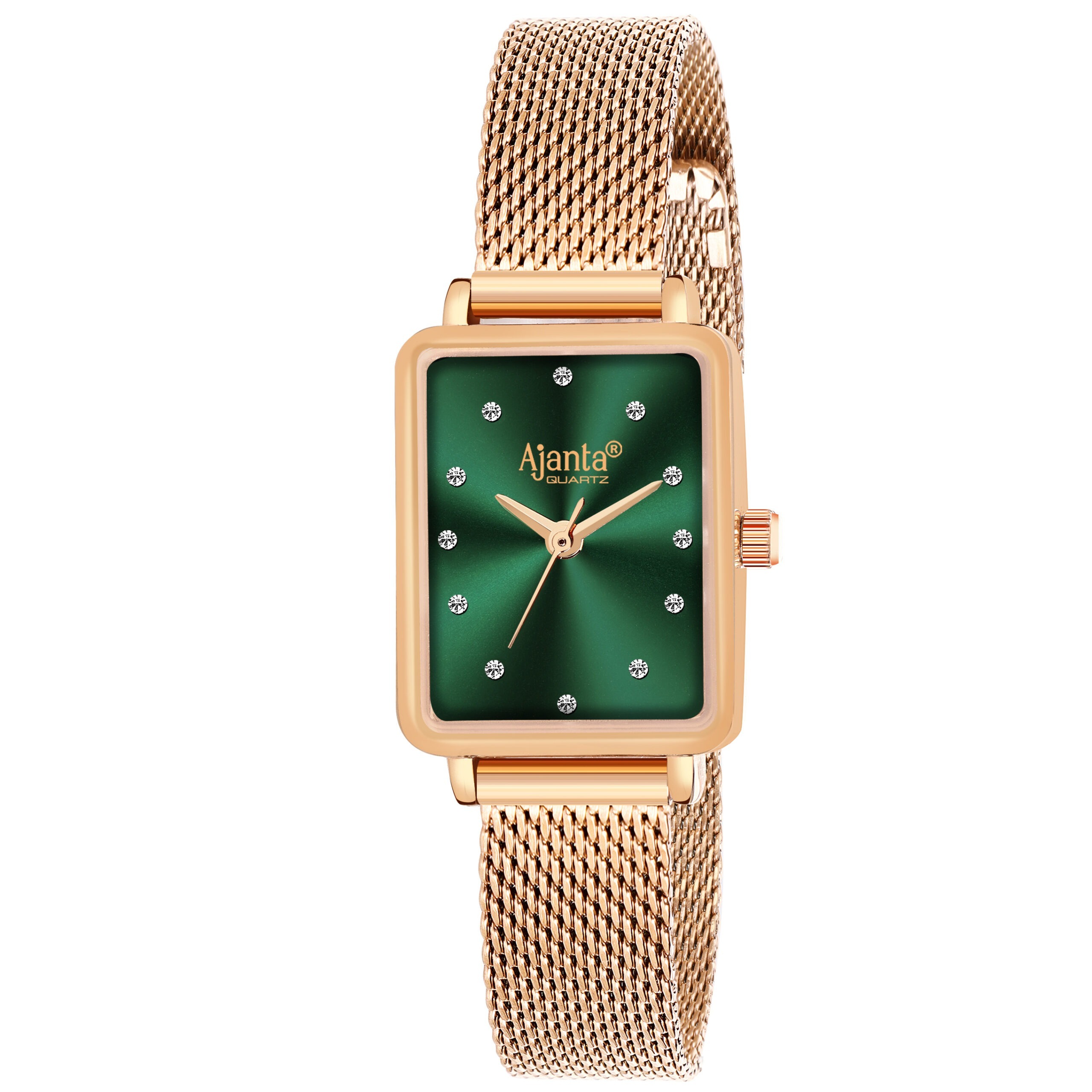 A sleek 27mm rectangular green dial watch with a stylish metallic mesh strap