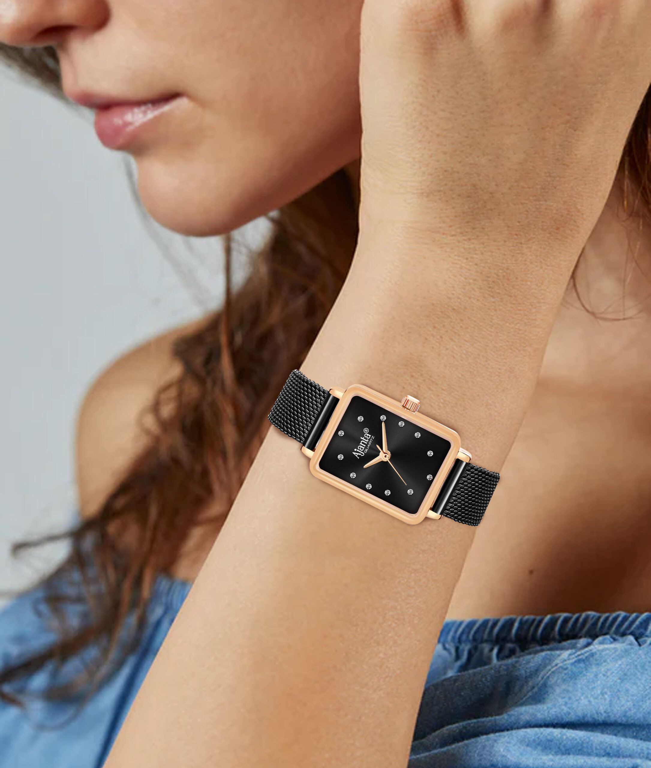 From the La Luna Collection, this stylish watch features a 27mm rectangular case with sleek edges and a black gradient dial adorned with crystal markers. The black metallic mesh strap complements the minimalist design. Powered by a SONY battery, it ensures reliable timekeeping.