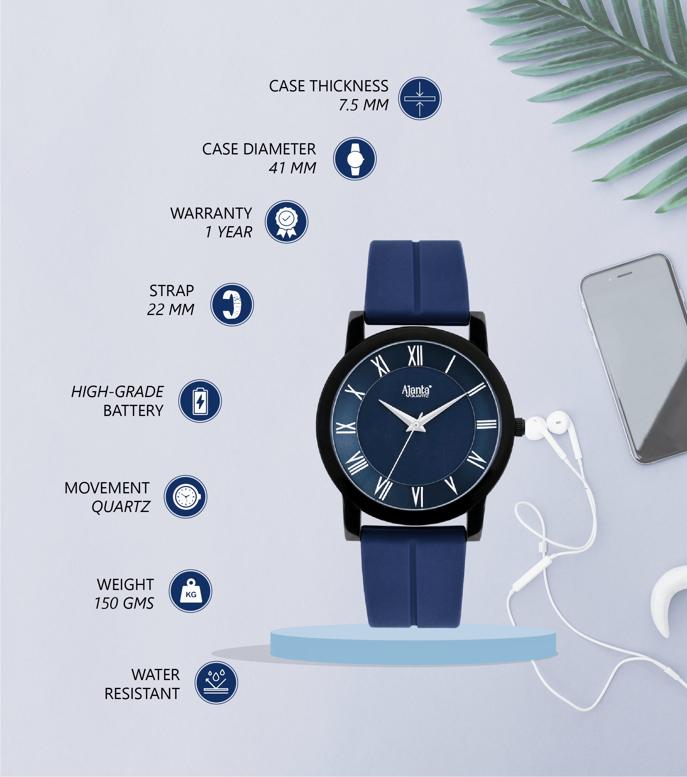 The AWC131-1 from the Nova Series features a sleek 41mm round case with a classic Roman numerals dial design. It is equipped with a blue silicone strap for comfort and a sporty touch. This timepiece brings together simplicity and sophistication, making it suitable for versatile styling.
