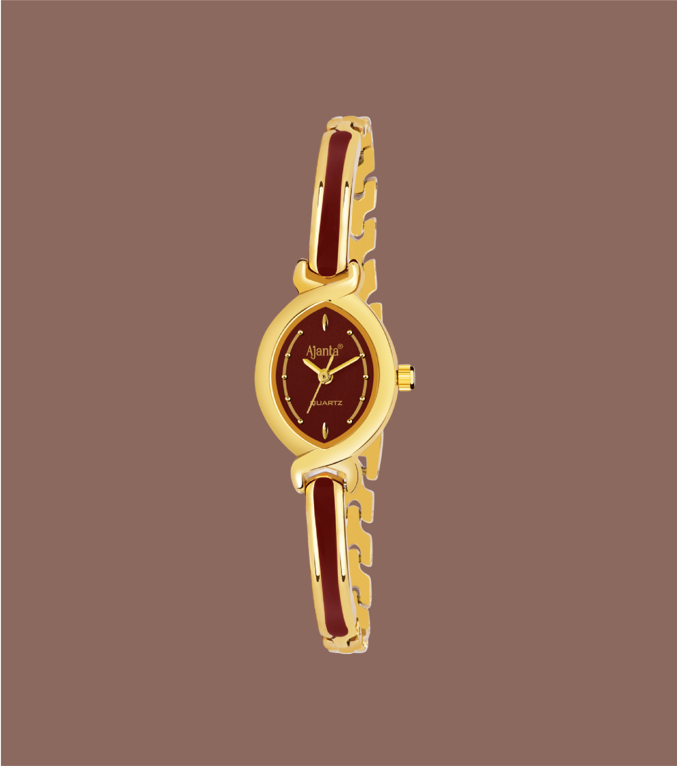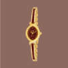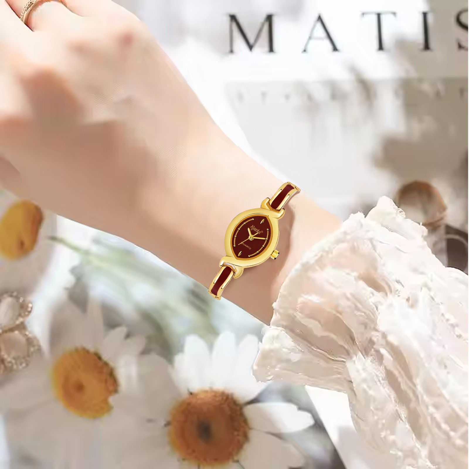 A 31 x 18mm oval ladies’ watch with a maroon dial and a gold-maroon stainless steel strap, perfect for polished everyday wear.