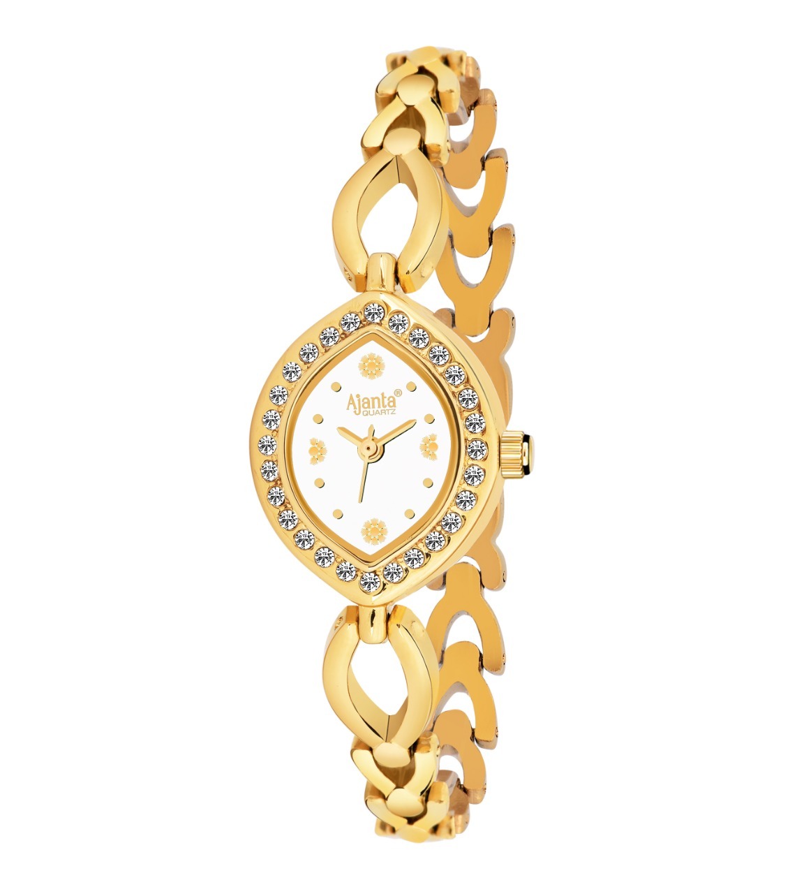 The Alaia Collection – AWC415-2 features a 30 x 20mm oval case with a stone-studded bezel and a floral white dial. Its rose gold metal strap with interlinked detailing adds a decorative charm, while the SONY battery and Japanese movement ensure lasting performance.