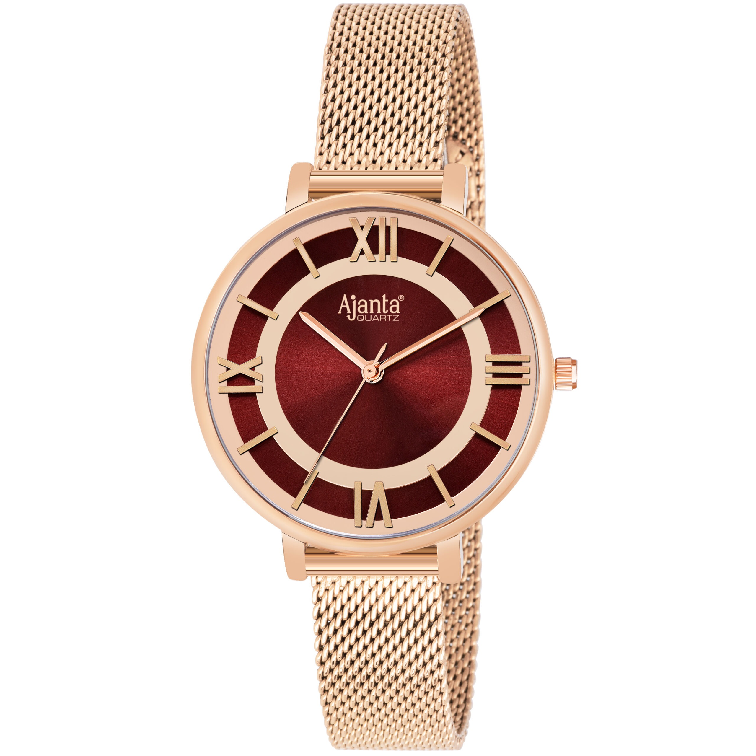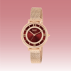 This Calyse model from A Whisper of Elegance stands out with its maroon dial and polished gold stainless steel strap. Crafted for those who prefer distinction in subtle forms, it features a bezel-free round face and SONY-powered movement inside a sleek 7 cm case.